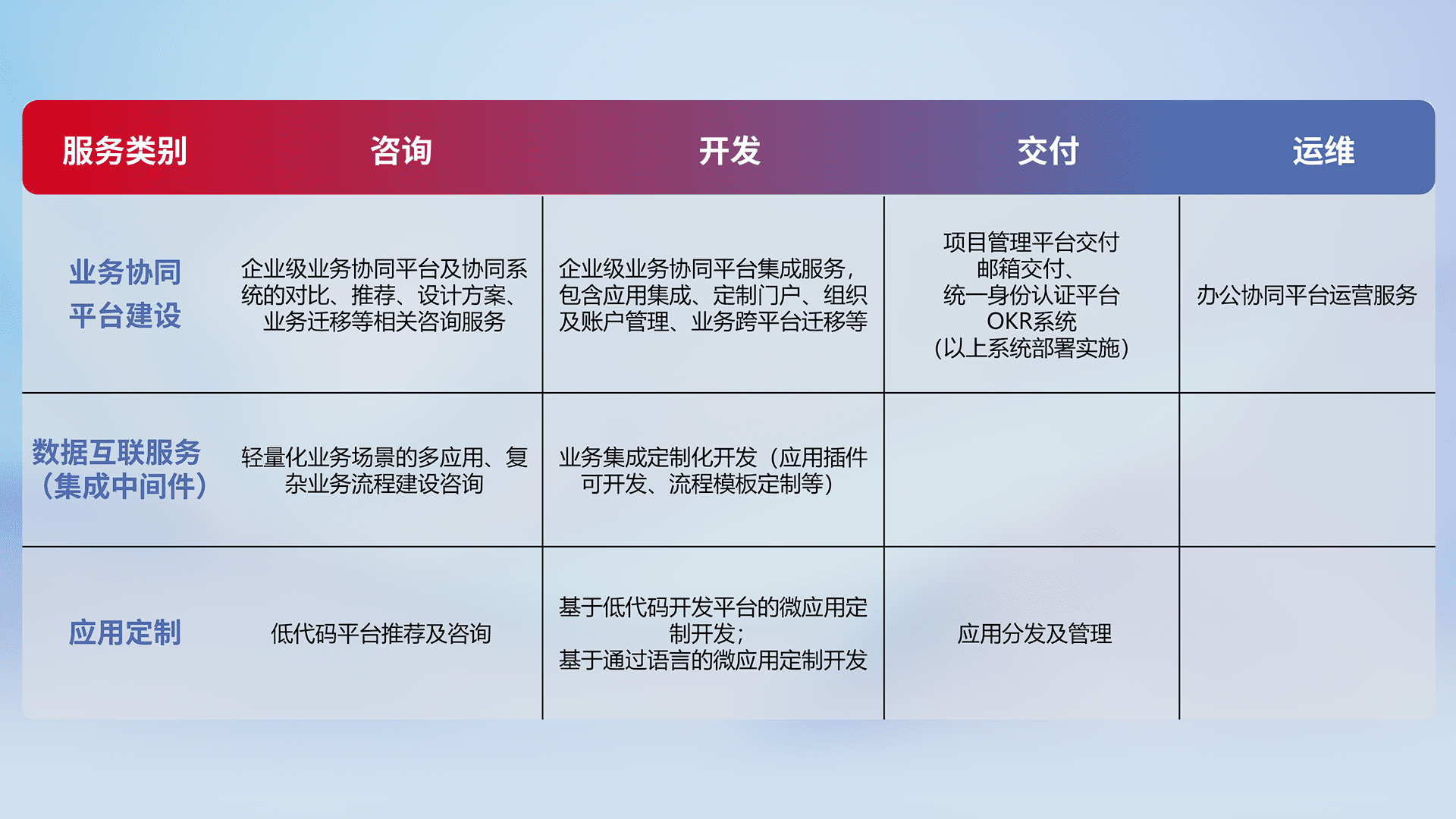 针对钉钉、、、、企微、、、IDaas等平台级产品提供产品的规划、、方案、、、交付、、、、定制化开发等服务,,实现如统一协同办公、、、智能客户服务、、混合会议管理、、、、智能数据查询、、等业务场景,,实现数字化转型。。。。
